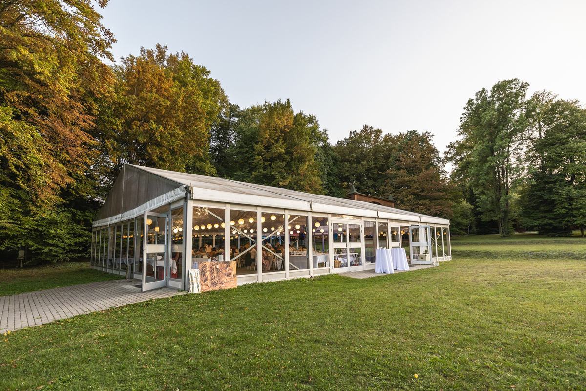 A lakodalom a 300 m2 alapterületű, üvegfalú sátorban valósítható meg, kör vagy táblaasztalos elrendezésben.