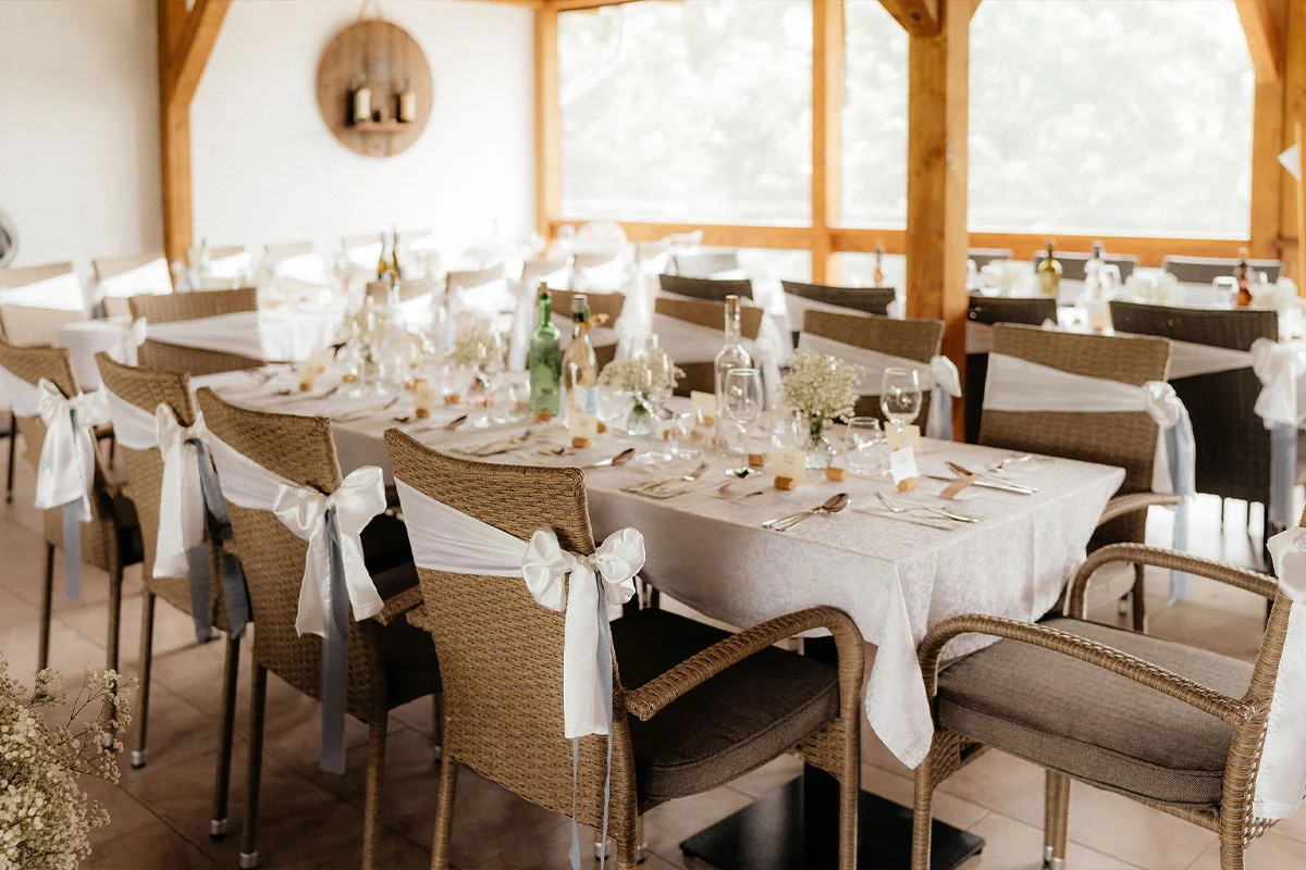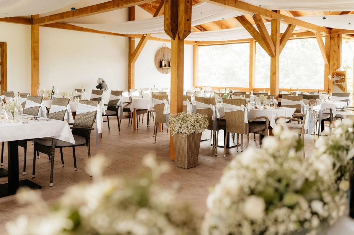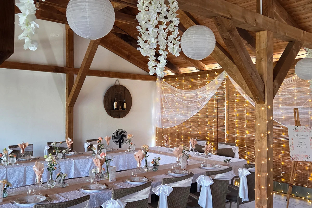 Nincsenek térbeli kötöttségek, a tereket úgy rendezzük be, ahogy szeretnétek. Ha kisebb, szűk családi esküvőre vágytok, akkor belső, ablakos, kertre néző termeinket – 30, illetve 55 férőhellyel – ajánljuk. Ha ennél nagyobb a násznép, akkor van egy tágas, fedett teraszunk, ahol egy nagyobb tánctér mellett 65, maximum 75 fő tud helyet foglalni. A termeink fűthetők, a terasz temperálása is biztosított, így akár az őszi vagy a téli szezonban is van lehetőség az esküvőtök megtartására.